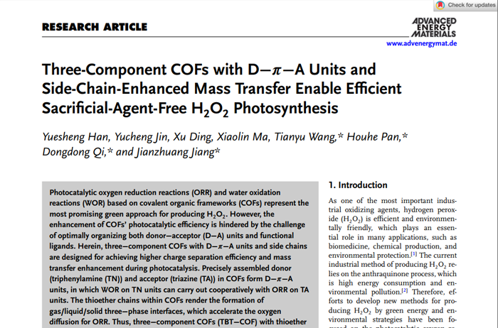 Three-Component COFs with D?π?A Units and Side-Chain-Enhanced Mass Transfer Enable E?cient Sacri?cial-Agent-Free H2O2 Photosynthesis